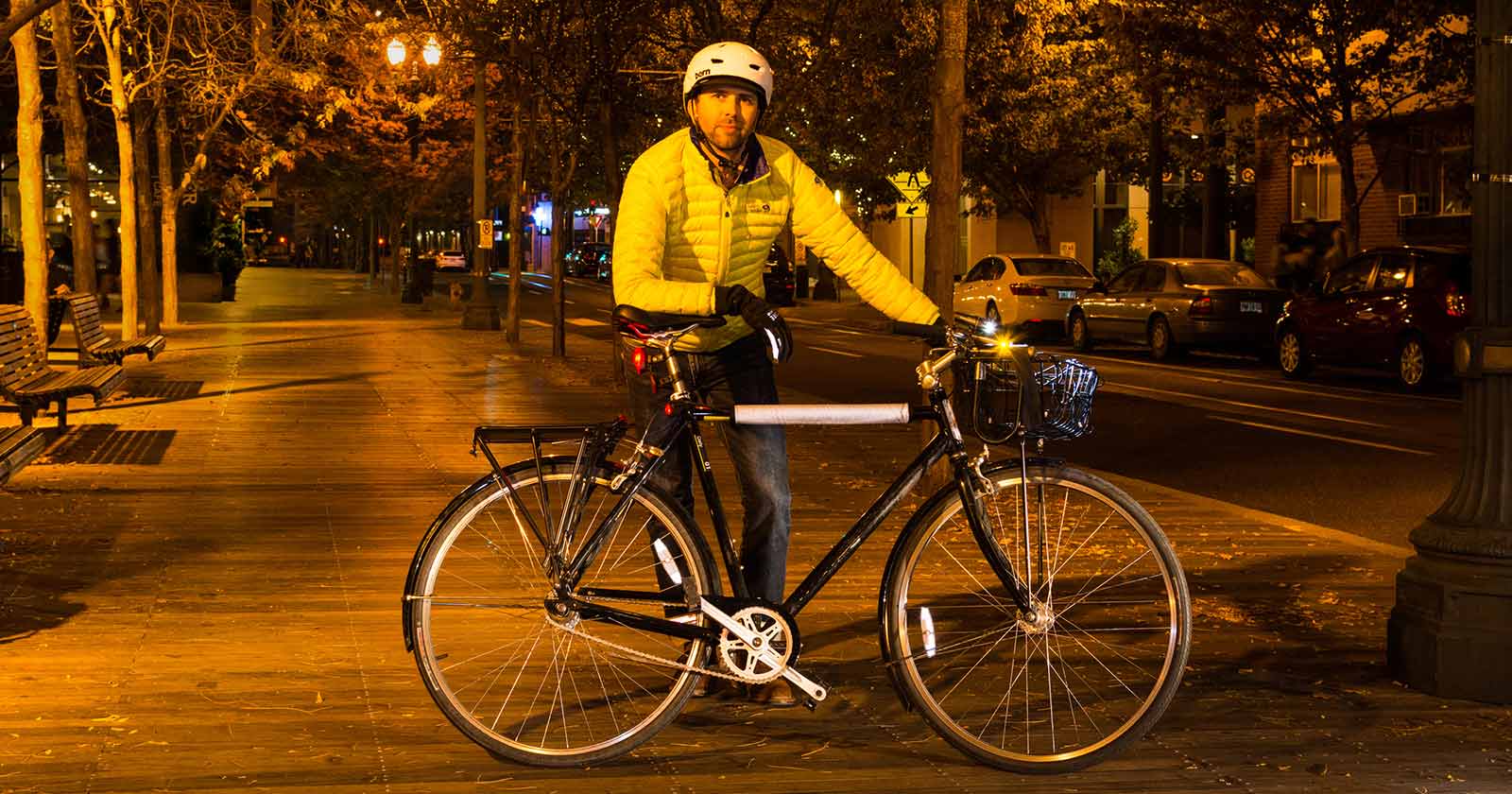 By law you must have a light in front and a red reflector in the back, before sunrise and after sunset. But don't stop there — add more than what’s required.