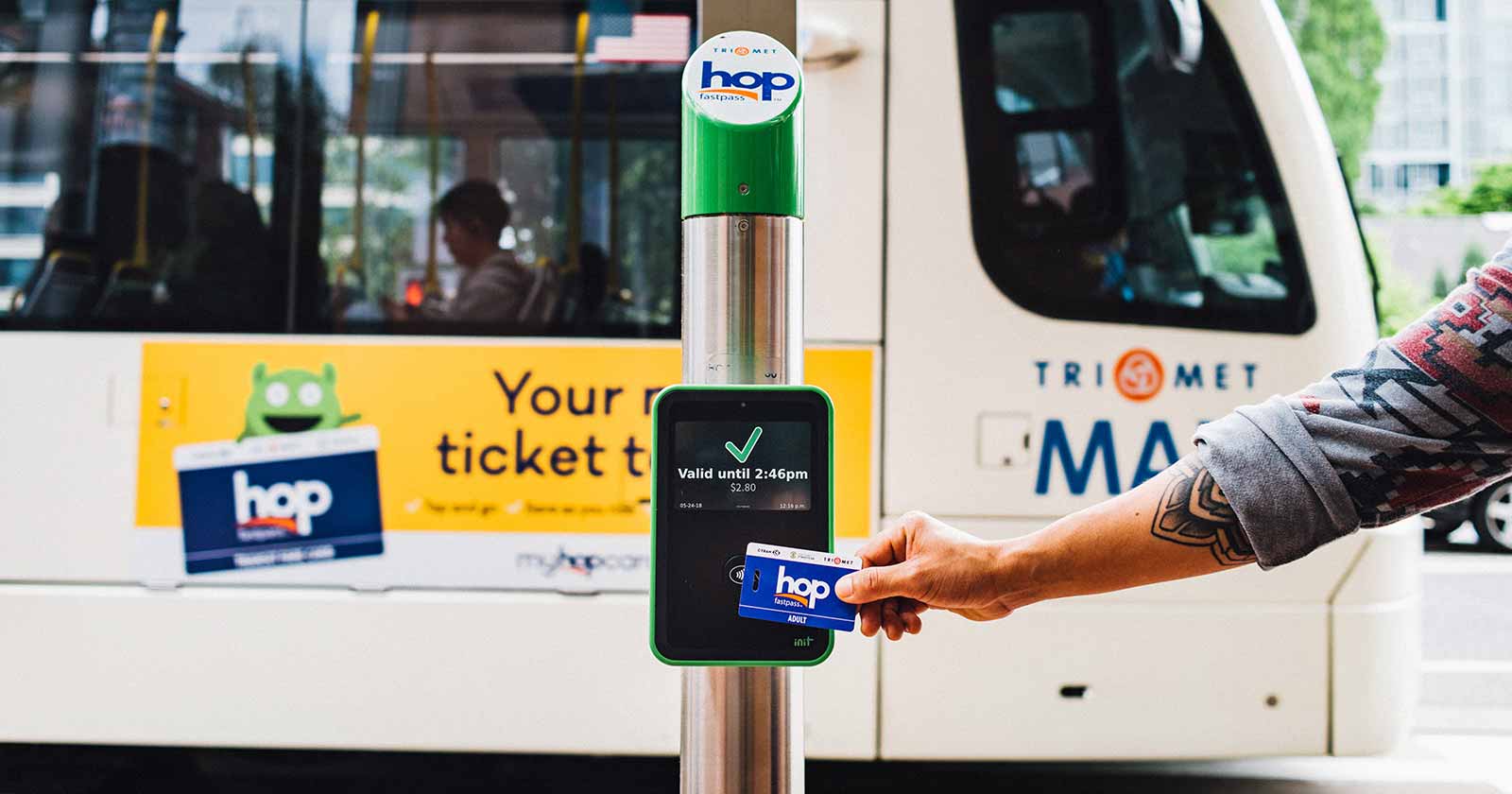 TriMet’s farecard is called Hop Fastpass® (or Hop for short). To pay, just tap the green Hop reader when you board. You can tap with your phone or contactless credit card to pay the $2.80 Adult fare. Or, if you qualify for reduced fare, get a Hop card.