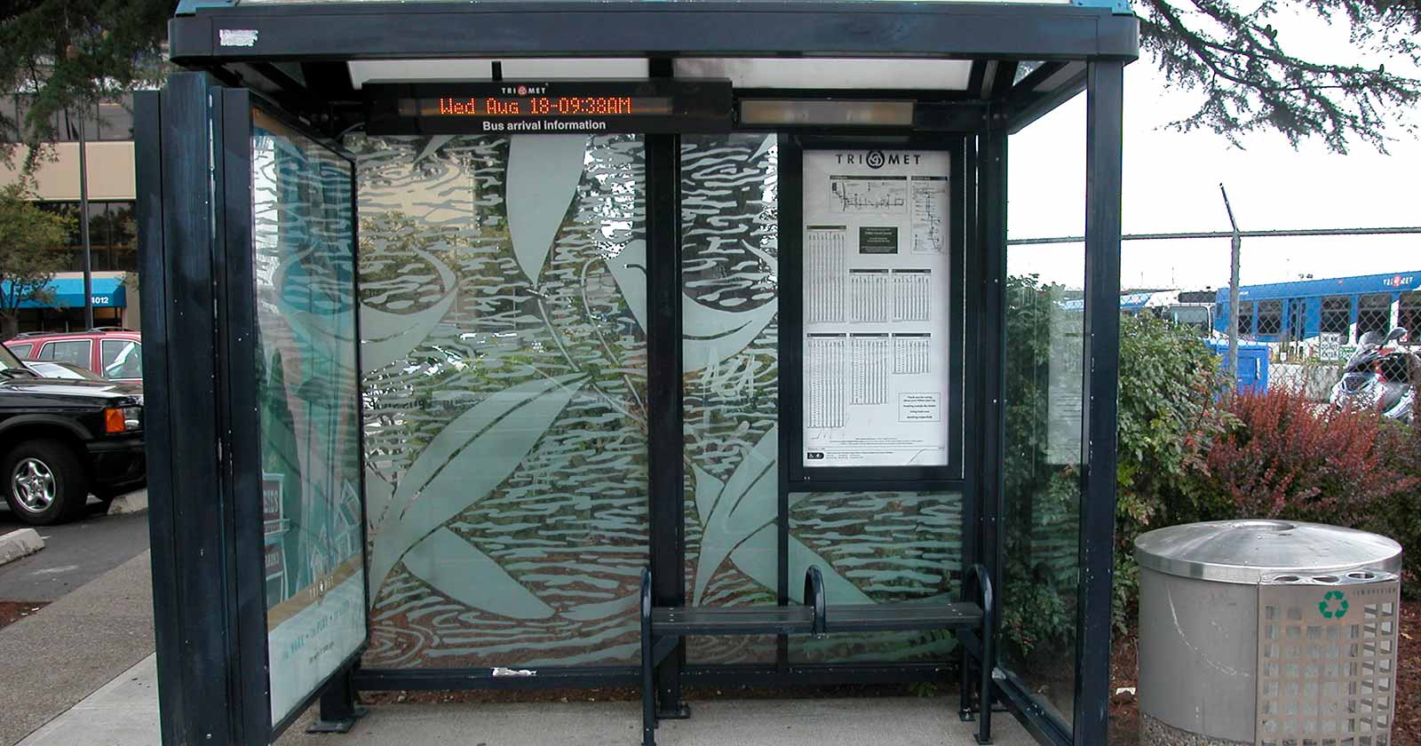 Since 2001, patterns have been sandblasted onto graffiti-damaged bus shelter glass panels and then reinstalled, saving on costs and reducing waste. New bus shelters are furnished with the art panels from the outset. The sandblasted panels minimize future vandalism, improve the appearance of the shelters, and enrich communities with artwork.
